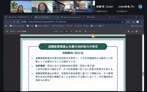 中間報告会では、その進捗をバッチリ報告し、CALEや日本法センターの先生方、一橋大学の得津先生、ノートルダム清心女子大学の岩瀬先生、JICA本部の塚原先生などから、とっても貴重なコメントをいただきました。